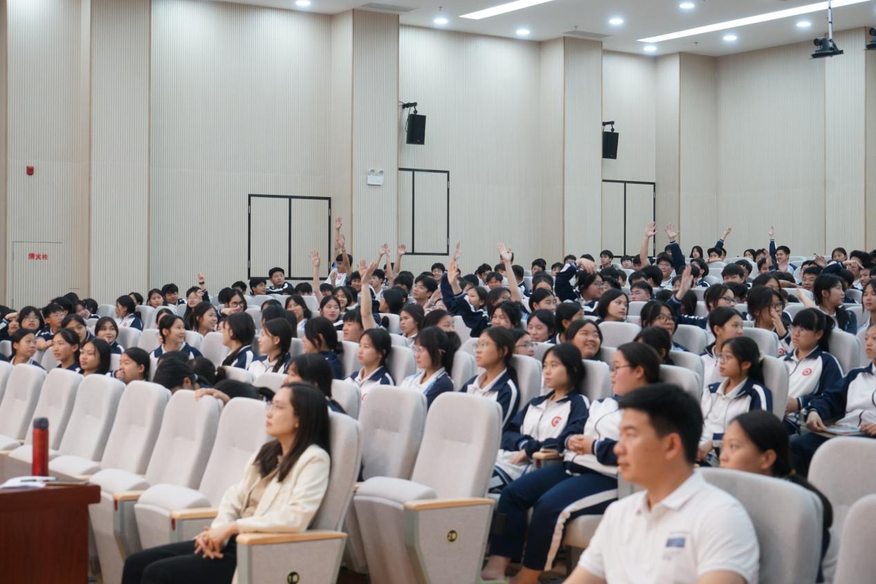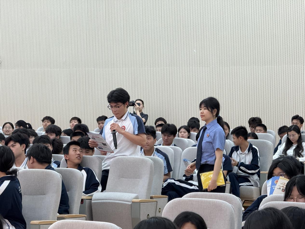 县法院工作人员主持趣味问答环节,围绕“谁是维护国家安全的主角”“发现危害国家安全行为如何应对”等问题与学生互动。参与者踊跃抢答,现场气氛热烈,法治教育寓教于乐。