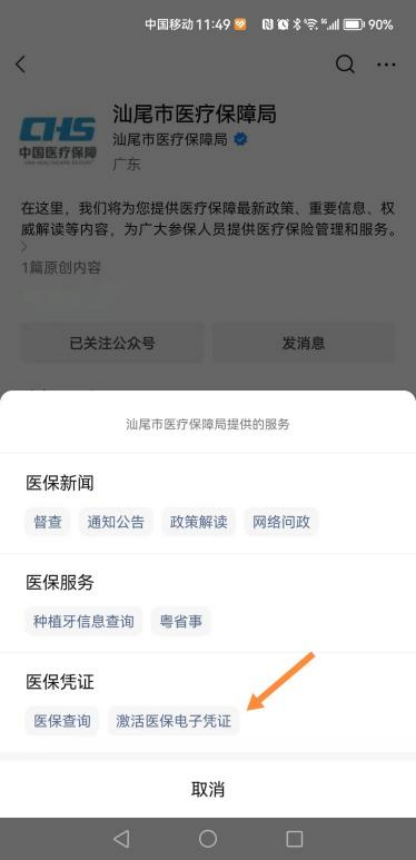参保人关注“汕尾市医疗保障局”微信公众号后进入主界面,点击“服务”,再点击下方的“激活医保电子凭证”,根据提示操作进行激活。