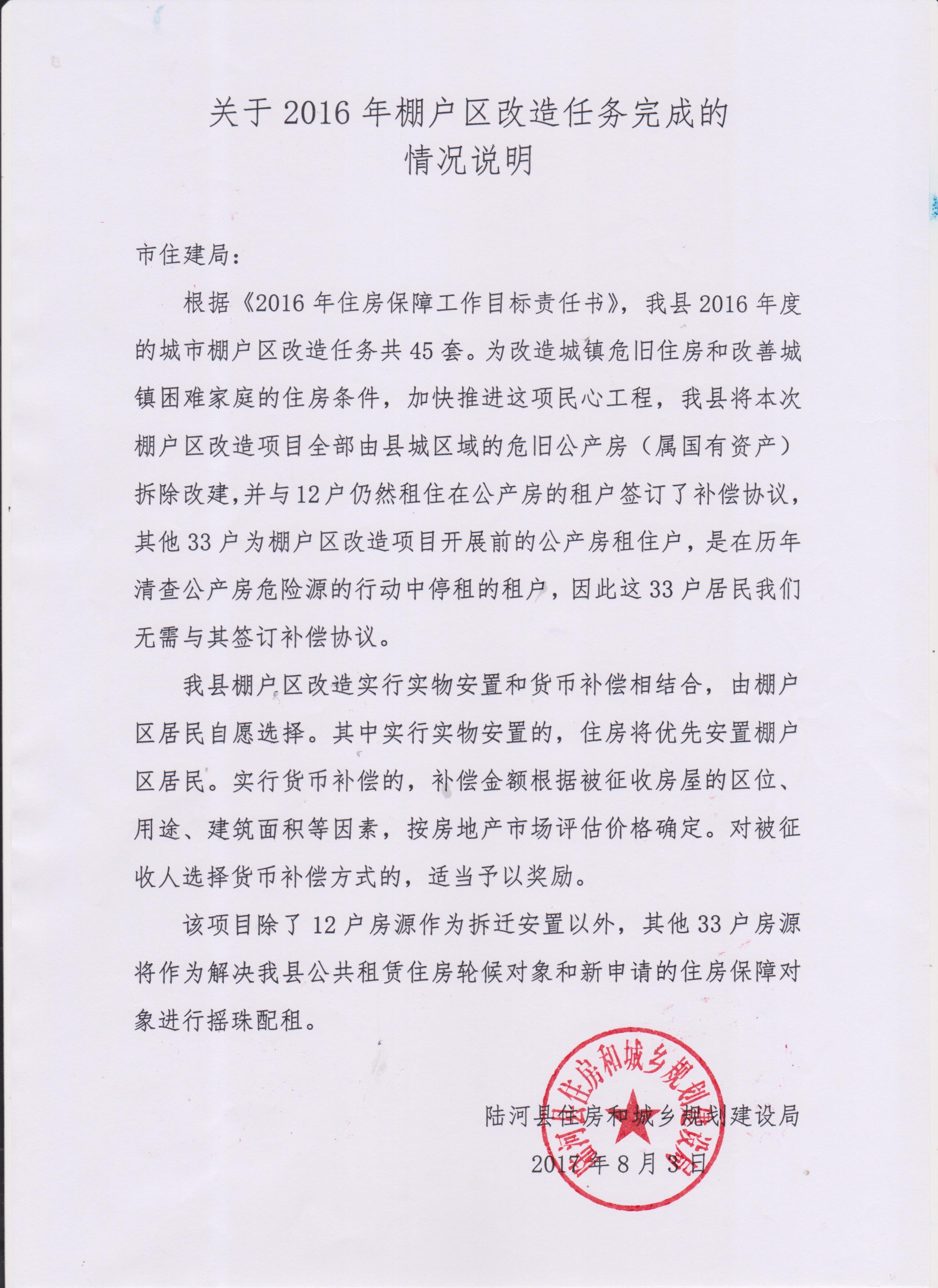 关于2016年棚户区改造任务完成的情况说明