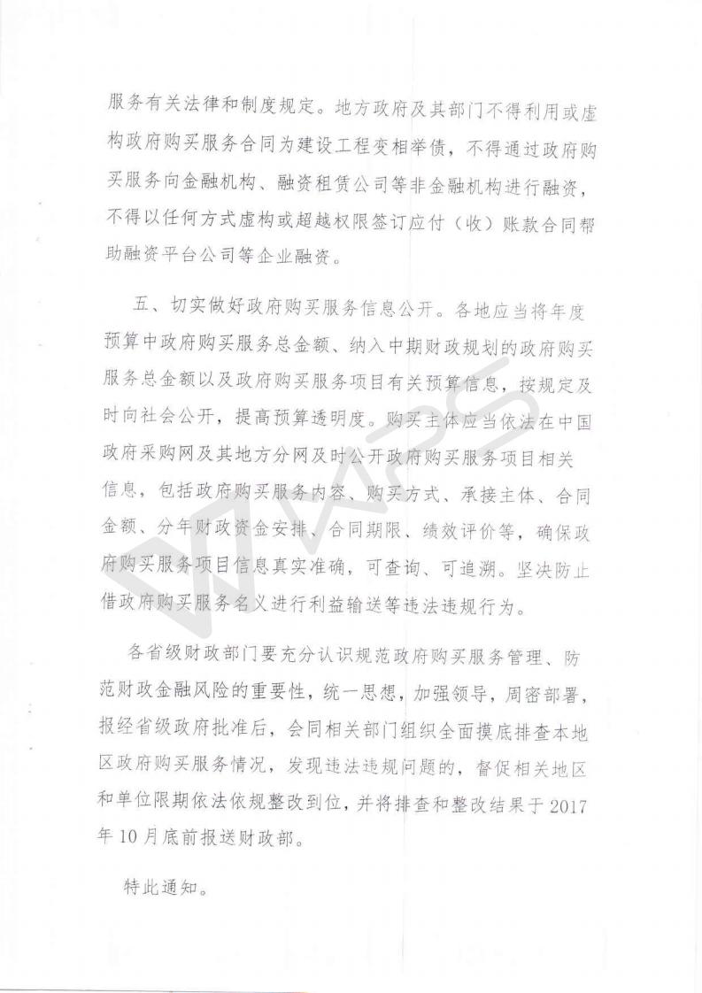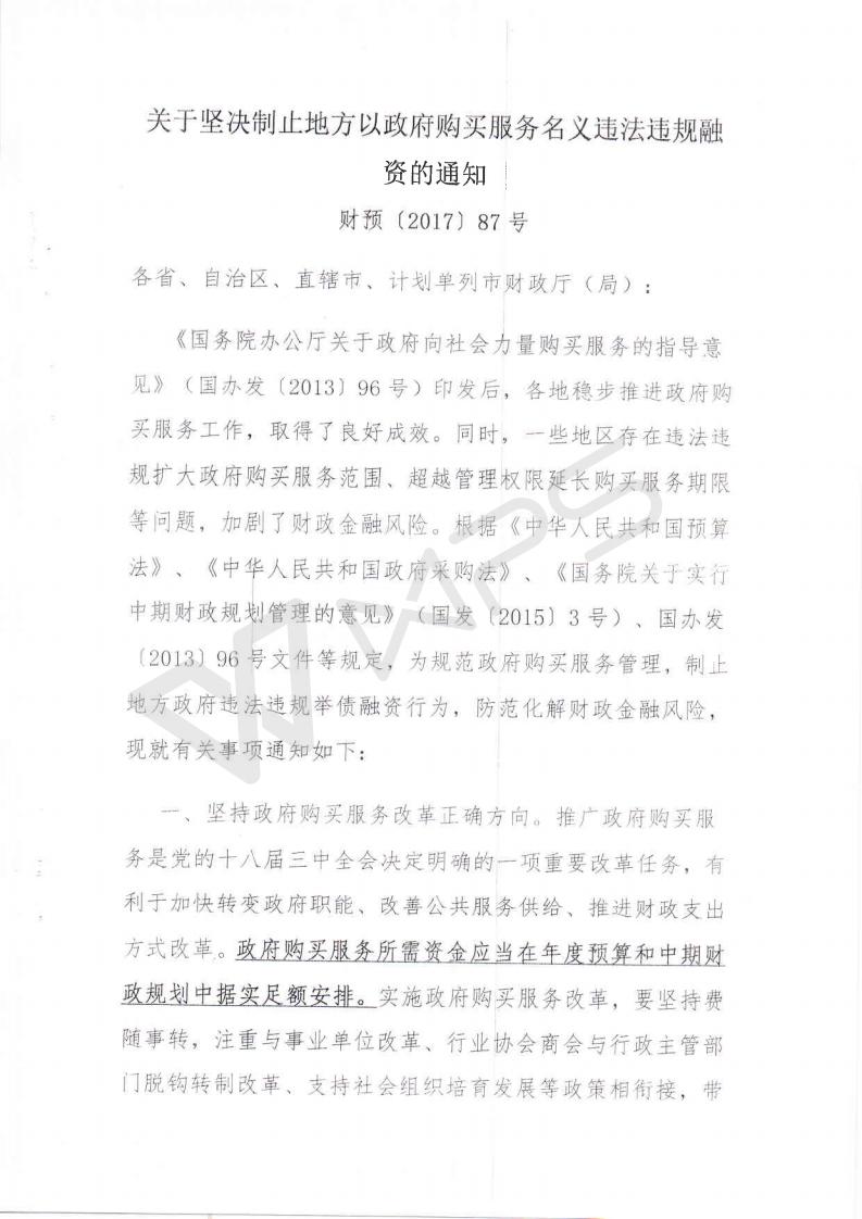 关于坚决制止地方以政府购买服务名义违法违规融资的通知(财预[2017]87号)