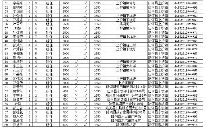为切实做好我县租赁补贴发放工作,解决城镇低收入家庭住房困难,根据国家保障性住房相关文件规定,经本人申请,居委会、各镇人民政府初审和公示,并经县住房保障部门会同县民政局复审,下列各申请人家庭符合我县租赁补贴发放条件,现予公示,公示期为20个工作日(2017年9月1日至9月20日)。公示期间如有异议,可以以书信、电话等形式向县住房保障工作领导小组办公室(地址:县城朝阳路住建局大楼二楼,电话:5665328)举报。公示期间如有举报,经查实的,将取消其保障资格和按照相关规定处理。