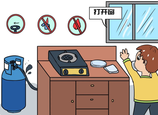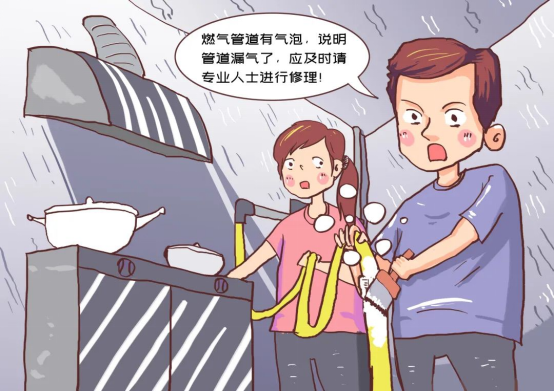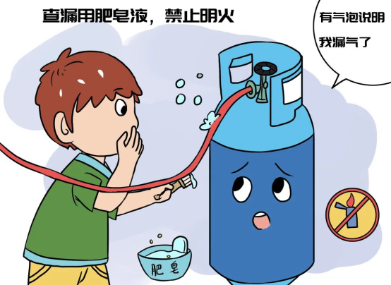 (1)燃气泄漏。当嗅到臭味时,液化石油气可能已出现泄露,此时应断绝一切明火,将肥皂水涂抹钢瓶的角阀、调压器、灶具开关和胶管等处检查,如果涂抹处冒出气泡,说明已经漏气,应立即关闭钢瓶角阀,打开门窗通风,禁止使用手机或碰触电器开关,移至通风安全处向供气单位报修。