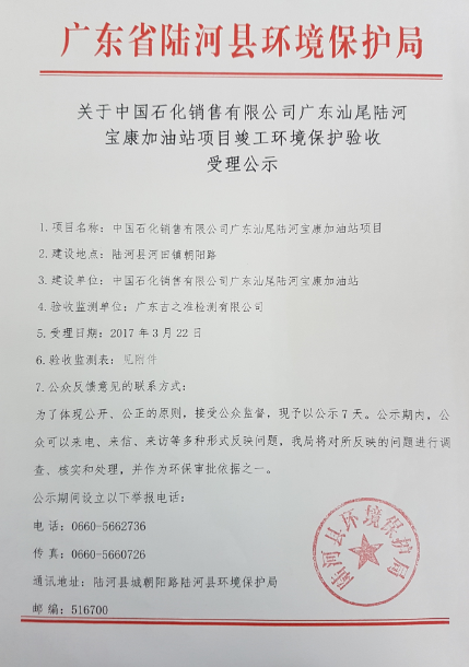 中国石化销售有限公司广东汕尾陆河宝康加油站项目竣工环境保护验收受理公示