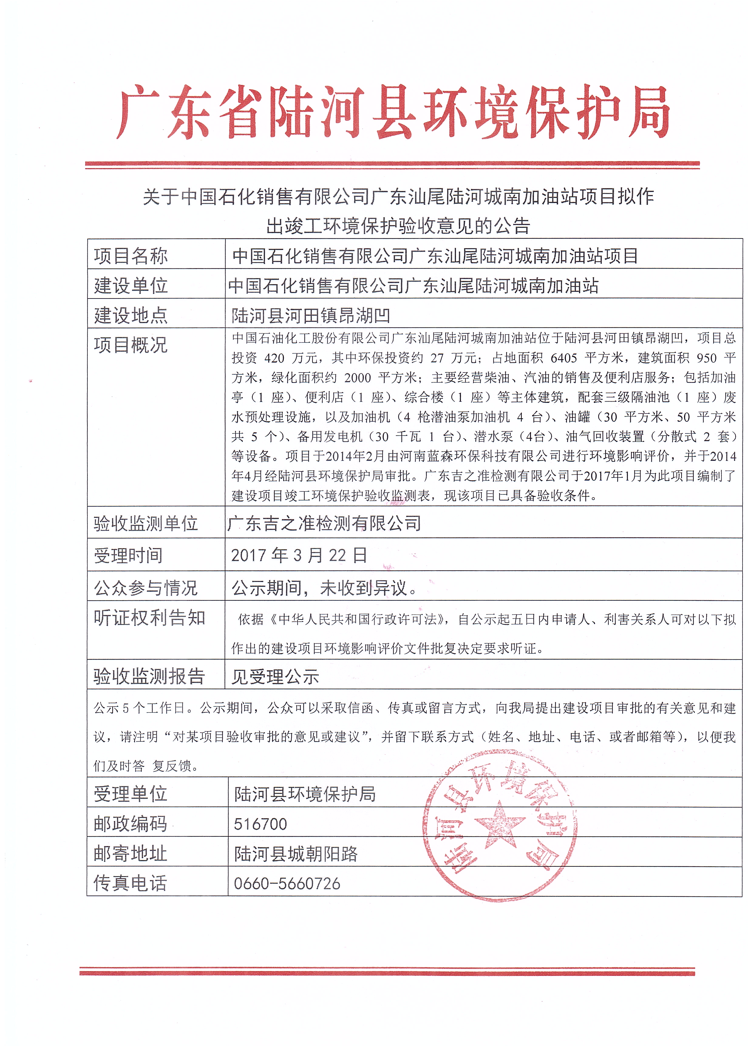 关于中国石化销售有限公司广东汕尾陆河城南加油站项目拟作出竣工环境保护验收意见的公告