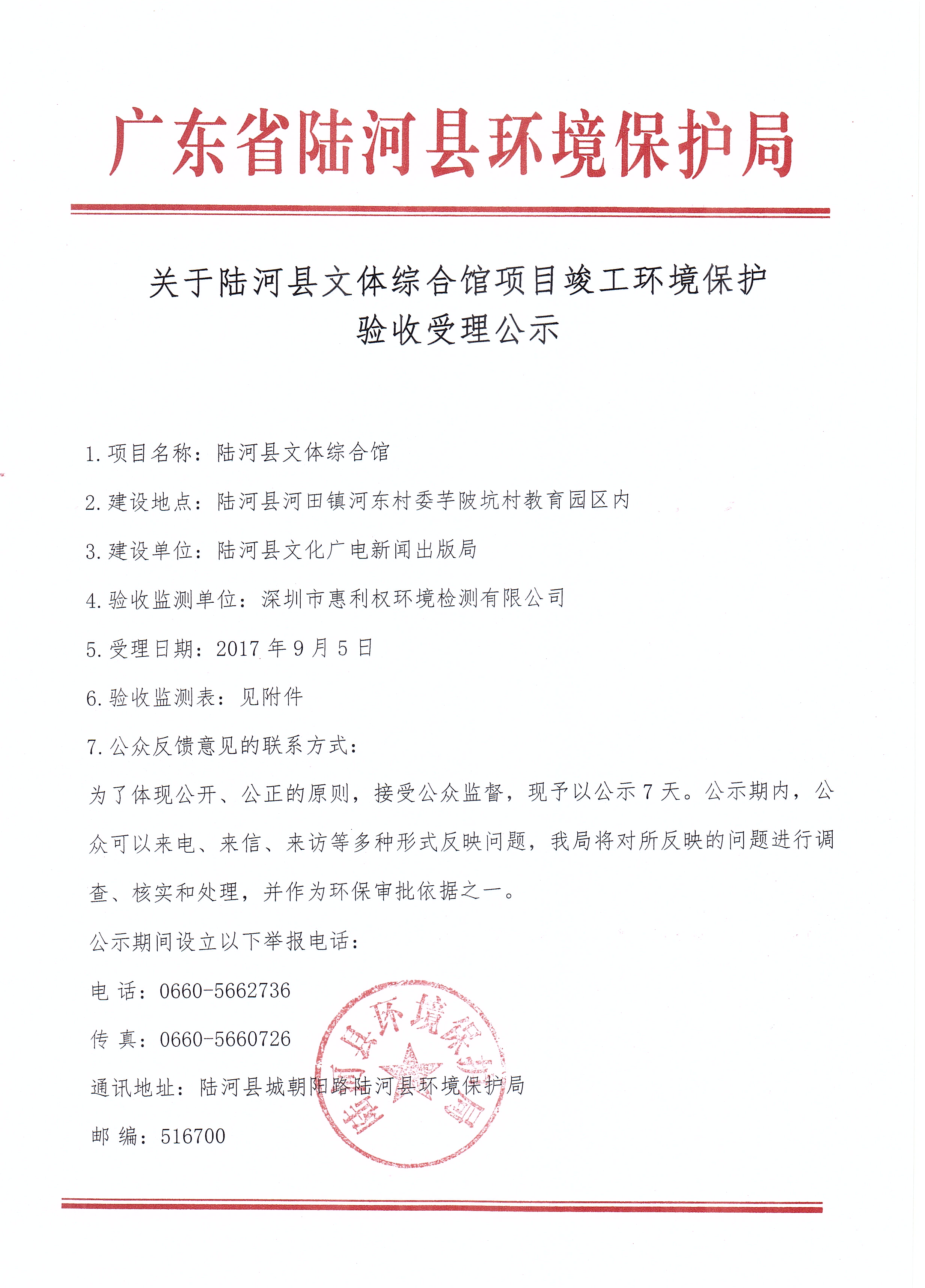 关于陆河县文体综合馆项目竣工环境保护验收受理公示