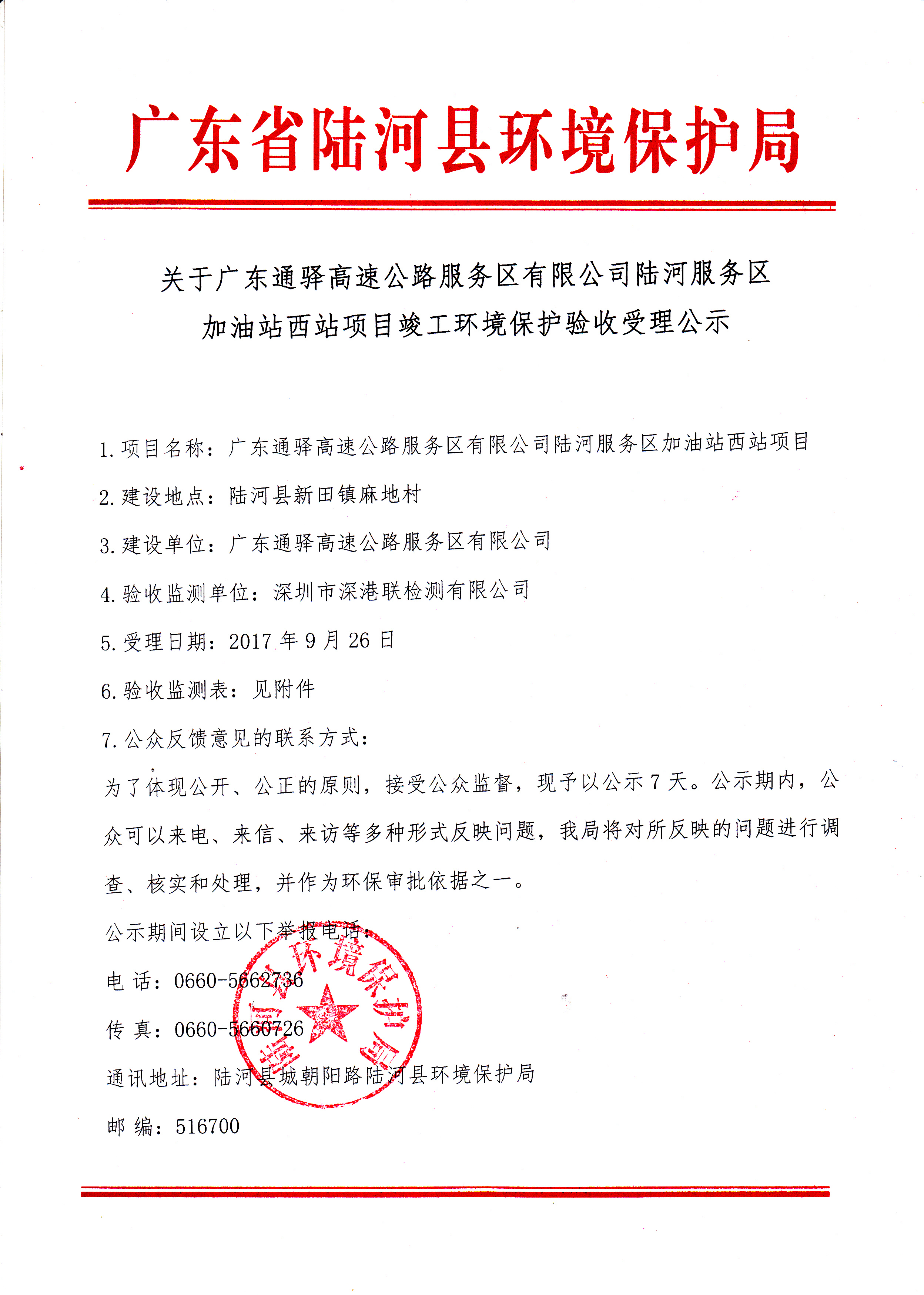 关于广东通驿高速公路服务区有限公司陆河服务区加油站西站项目竣工环境保护验收受理公示