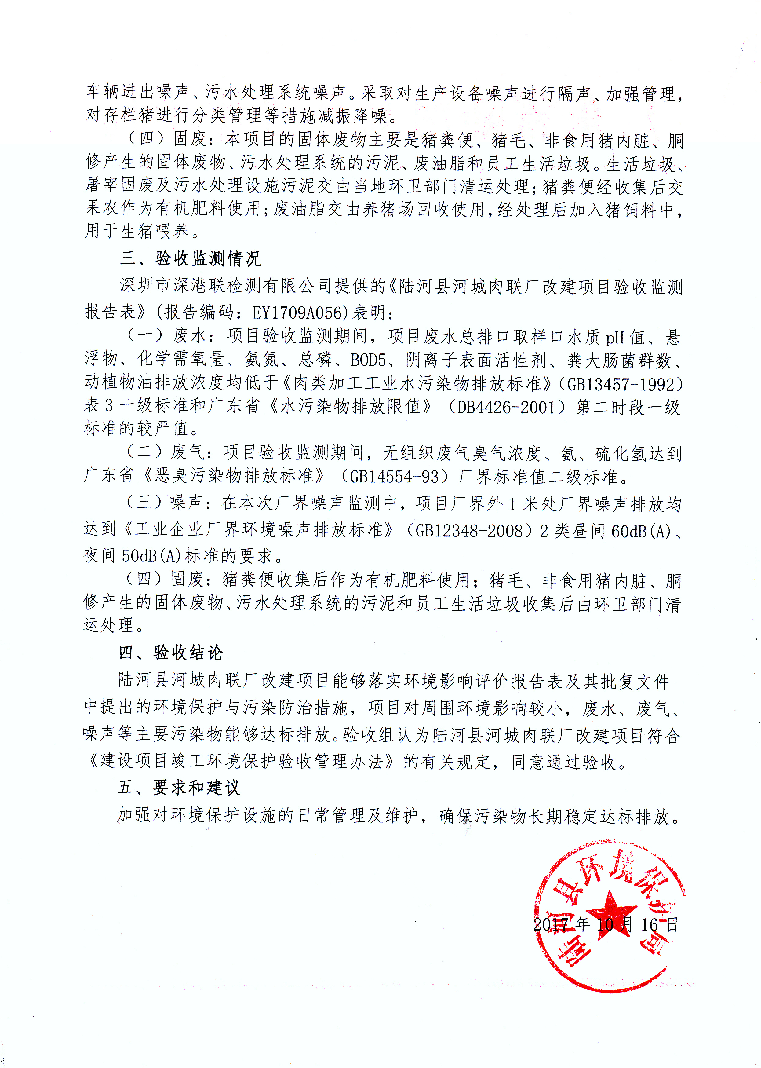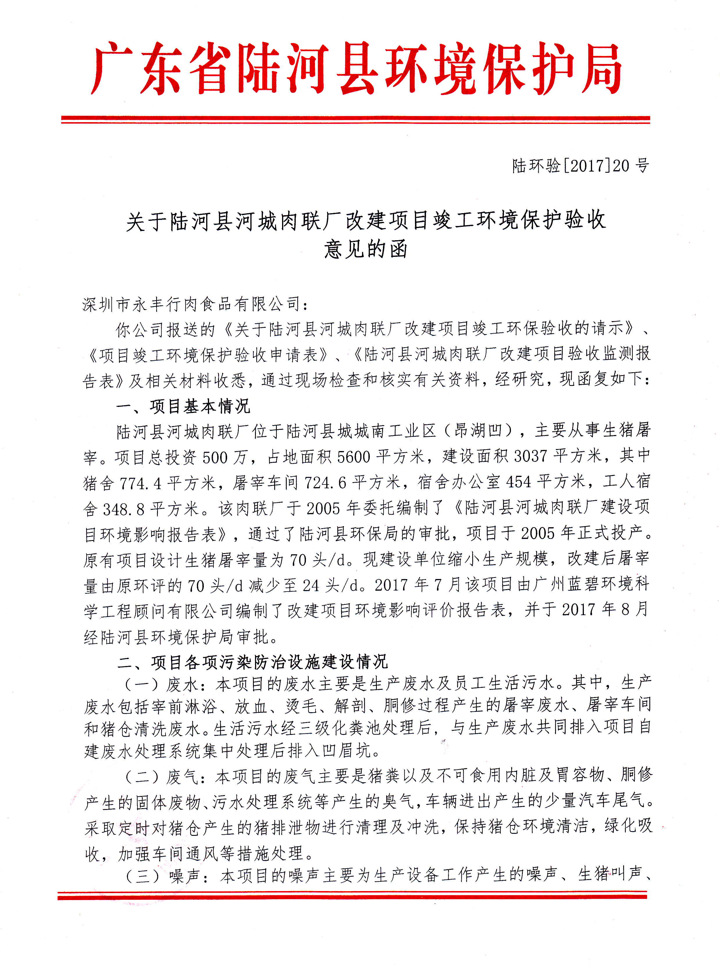关于陆河县河城肉联厂改建项目竣工环境保护验收意见的函
