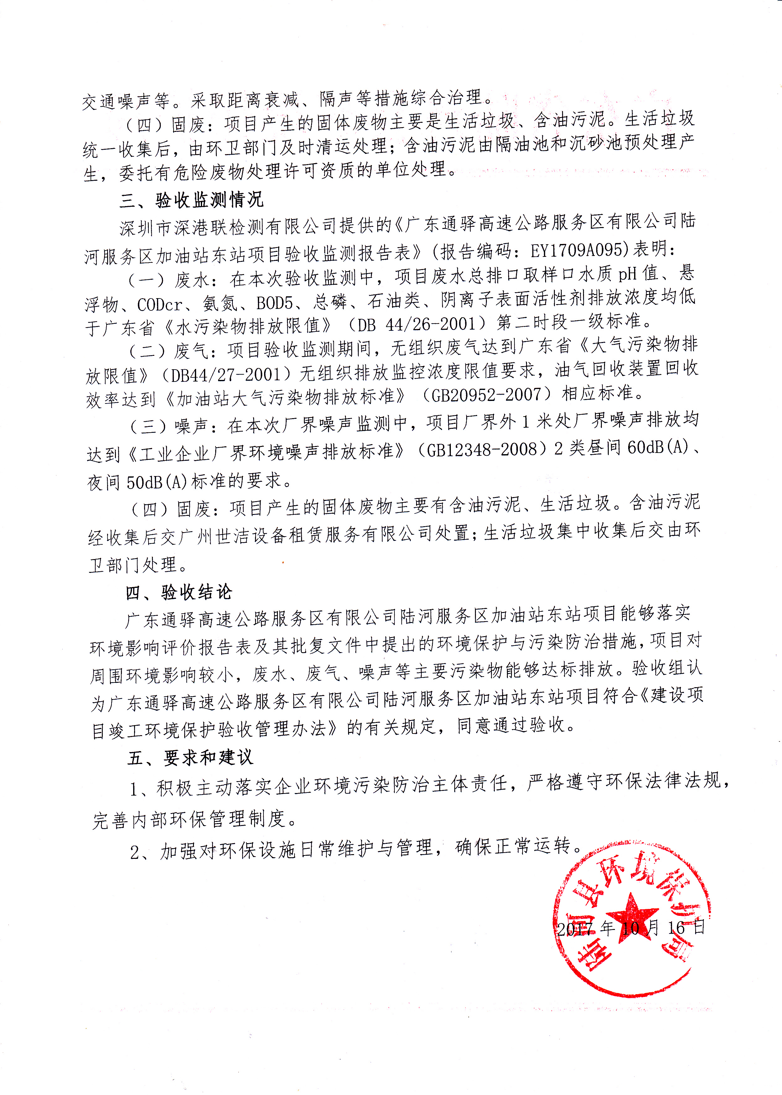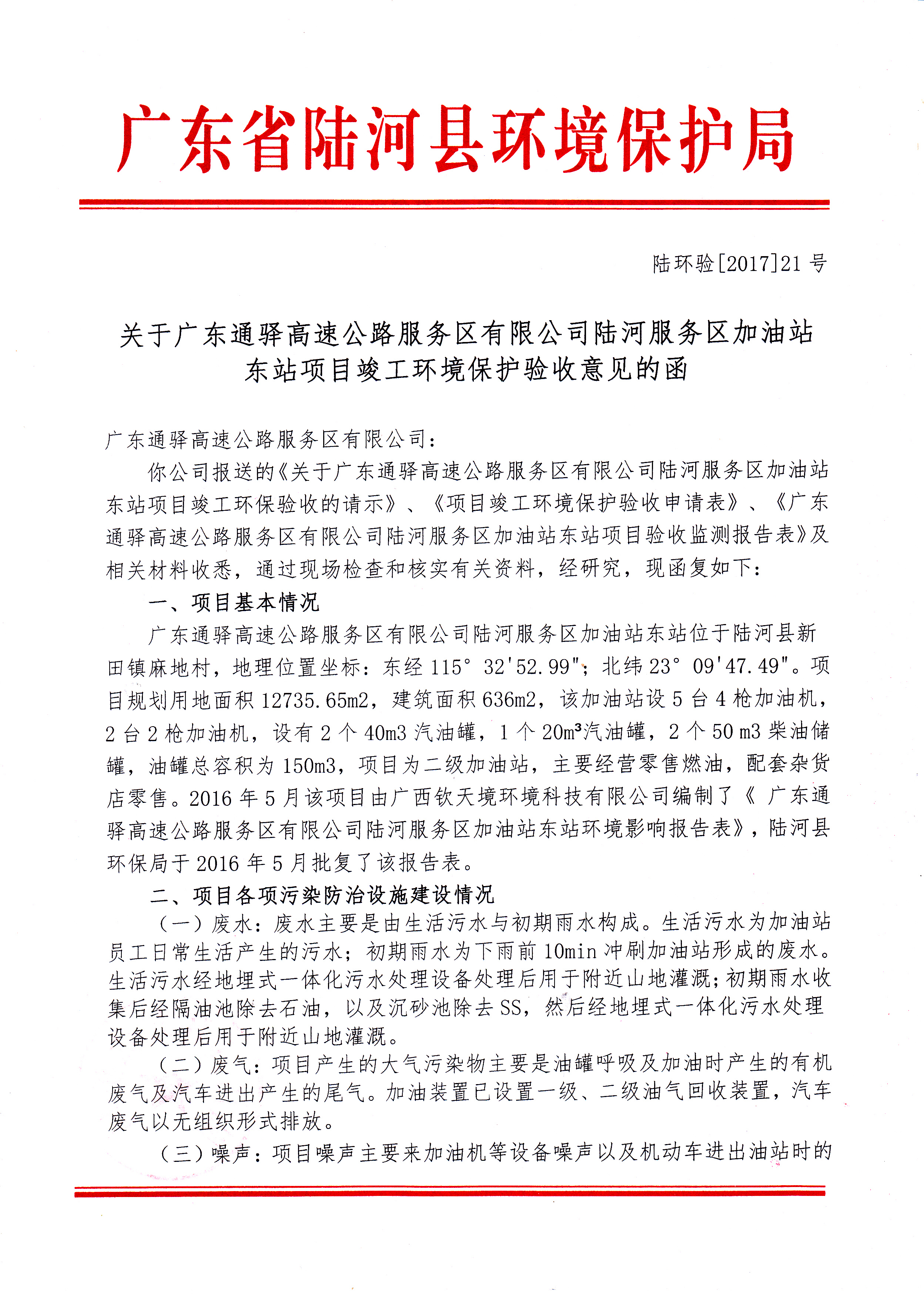 关于广东通驿高速公路服务区有限公司陆河服务区加油站东站项目竣工环境保护验收意见的函