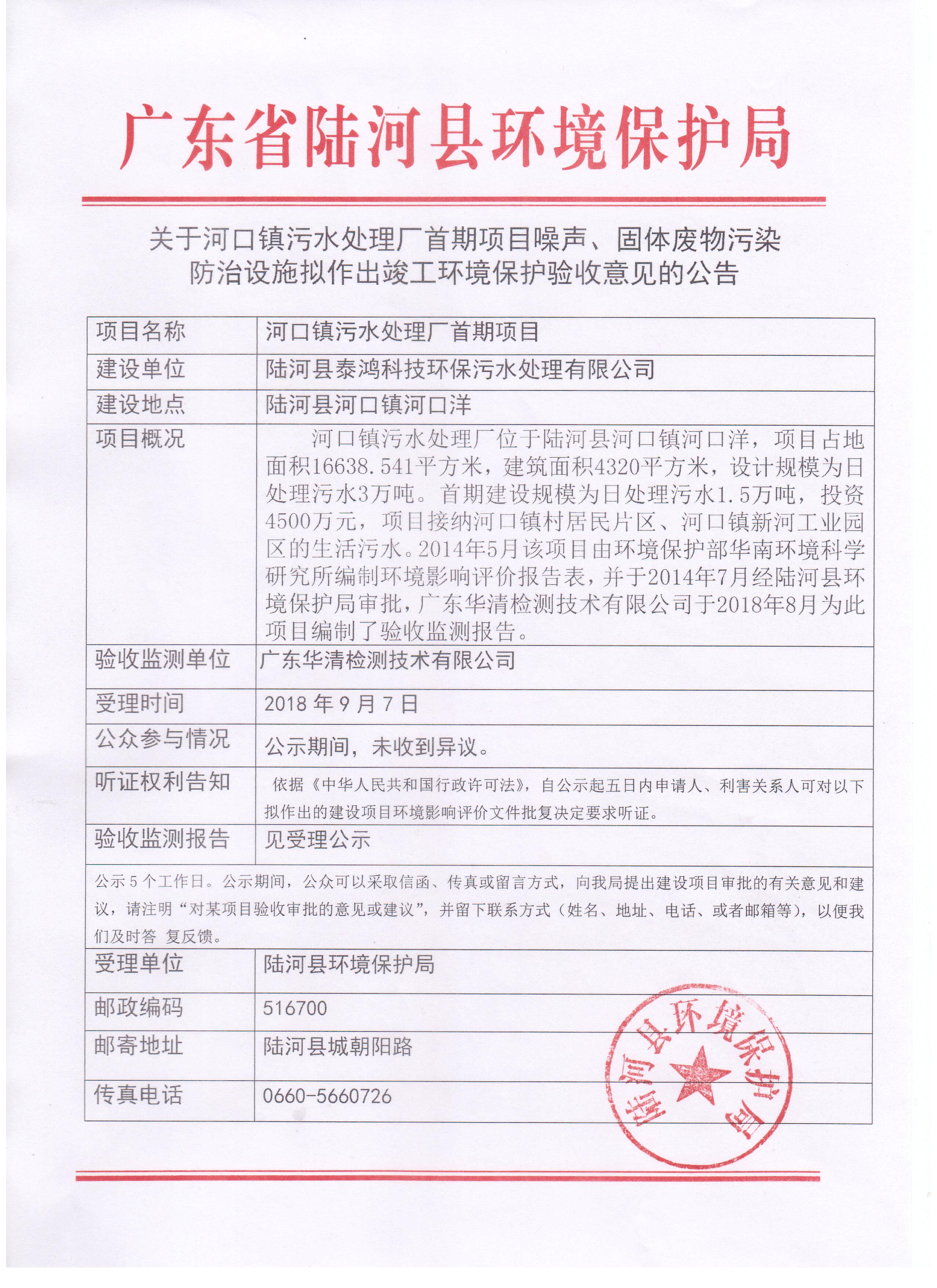 关于河口镇污水处理厂首期项目噪声、固体废物污染防治设施拟作出竣工环境保护验收意见的公告