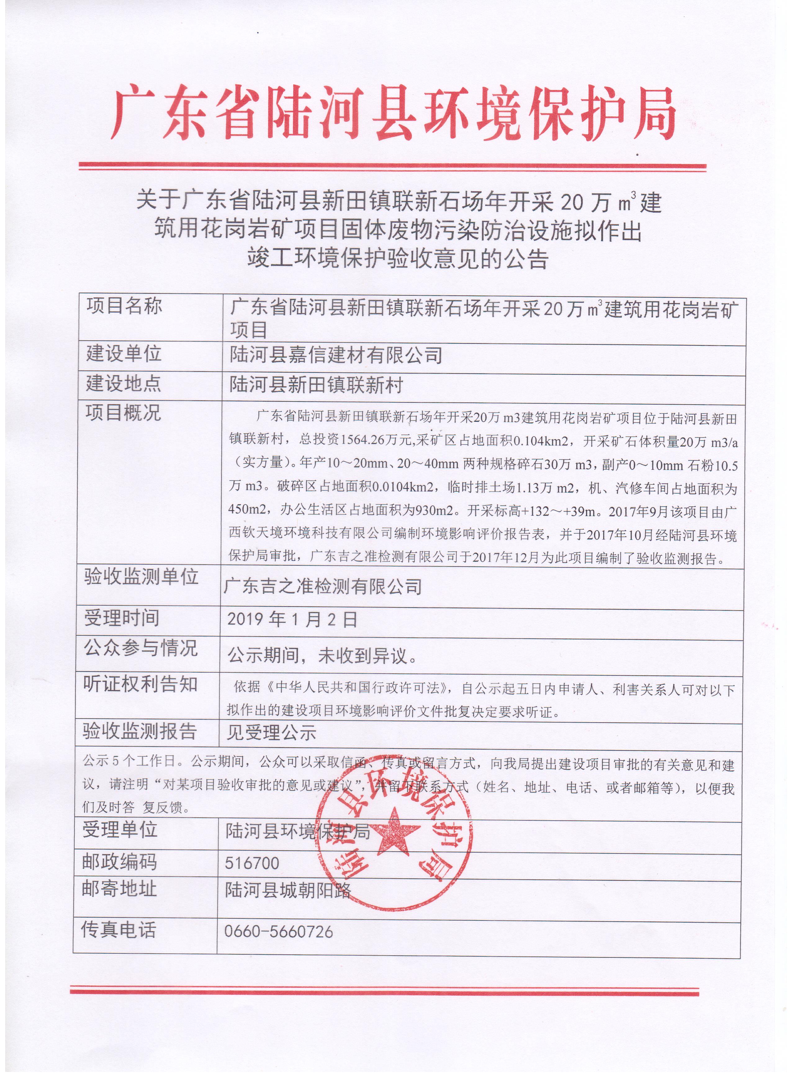 关于广东省陆河县新田镇联新石场年开采20万m3建筑用花岗岩矿项目固体废物污染防治设施拟作出竣工环境保护验收意见的公告