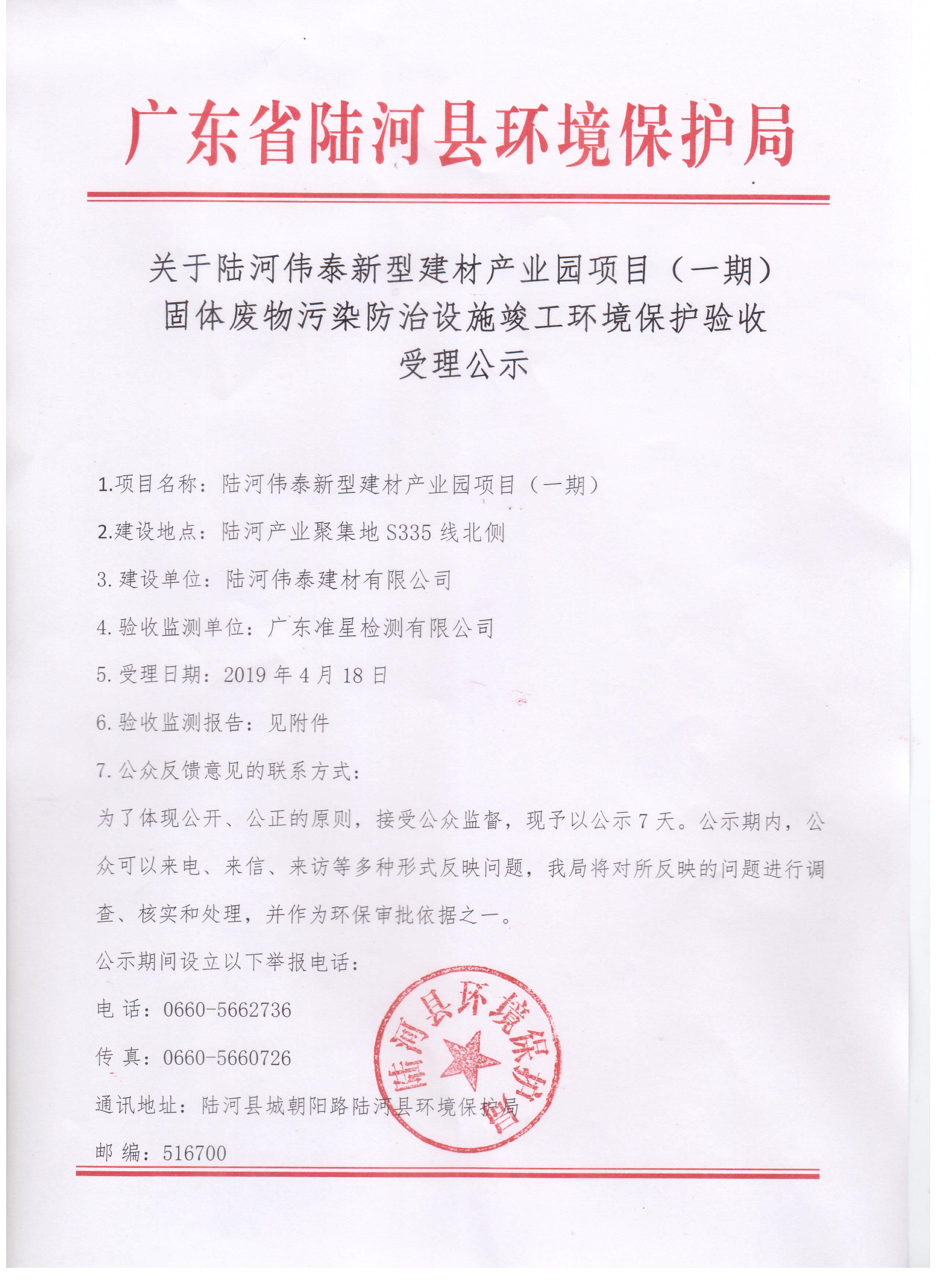 关于陆河伟泰新型建材产业园项目(一期)固体废物污染防治设施竣工环境保护验收受理公示