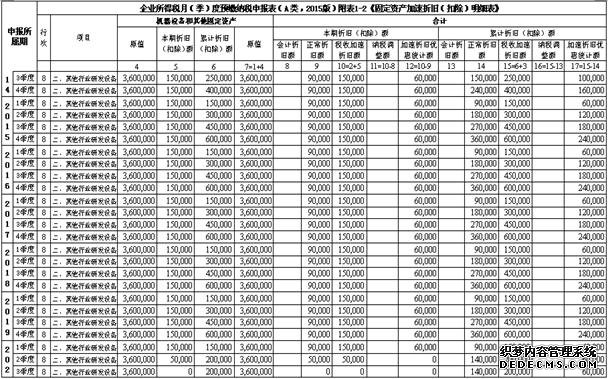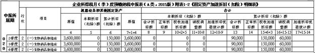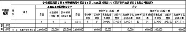 注2:根据固定资产按规定享受税收加速折旧的情况填写第1列至第6列,其中“累计折旧(扣除)额”填写固定资产自本年度1月1日至当月(季)度的累计折旧(扣除)额。例一中A企业享受税收加速折旧的固定资产属于“机器设备和其他固定资产”,应把固定资产按规定享受税收加速折旧情况填写在第4列至第6列(第1列至第3列已省略)。