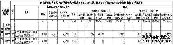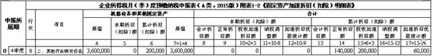 注4:当税收加速折旧额小于按会计折旧额时,不再填写本表的当期数,年度内保留累计数。例三中C企业固定资产税收折旧于2014年3季度预缴申报时一次性税前扣除,2014年4季度预缴申报时,固定资产税收加速折旧额为0,因此2014年4季度的当期数为0,累计数保留至2014年4季度。