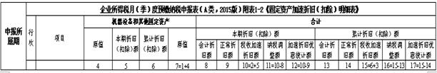 注3:对于会计采取正常折旧方法,税收加速折旧的固定资产,填写第8列、10列、11列和第13列、15列、16列,据此进行纳税调减;对于会计与税收均加速折旧的固定资产,填写第9列、10列、12列和第14列、15列、17列。其中,第9列、第14列为假定该资产未享受加速折旧政策,根据该项固定资产视同按照税法规定最低折旧年限用直线法估算的折旧额填写,据此统计享受优惠政策情况。