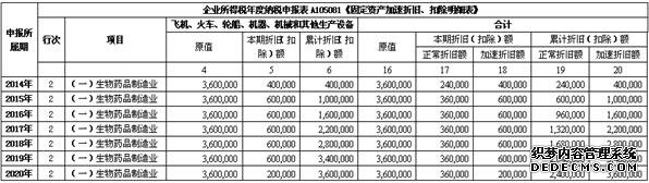 注3:会计采取正常折旧方法,税收加速折旧的固定资产,按照会计账册反映的折旧额填写第17列、第19列,第17列-第18列的差额,反映本期享受税收加速折旧优惠政策导致应纳税所得额减少的金额,在年度申报表附表A105080《资产折旧、摊销情况及纳税调整明细表》进行纳税调整。例一中A企业按照第18列的总计数,填报年度申报表附表A105080《资产折旧、摊销情况及纳税调整明细表》第3行“(二)飞机、火车、轮船、机器、机械和其他生产设备”的“税收金额”中第6列“本年加速折旧额”与第7列“其中:2014年及以后年度新增固定资产加速折旧额”,进行纳税调整。