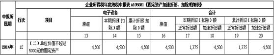 例三:C企业实行按季度查账征收企业所得税,2014年4月15日购进一台全新的电子设备并投入使用,价值4500元,暂不考虑残值,2014年2季度已采取直线法计提折旧,在2014年9月,按照固定资产加速折旧税收优惠政策,其折余价值部分作一次性税前扣除。