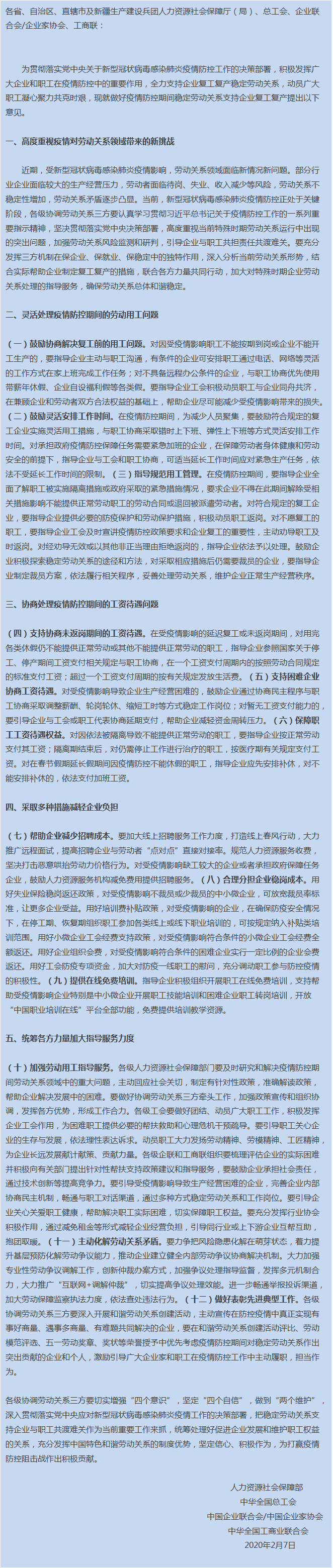 稳定劳动关系支持企业复工复产的意见》的通知