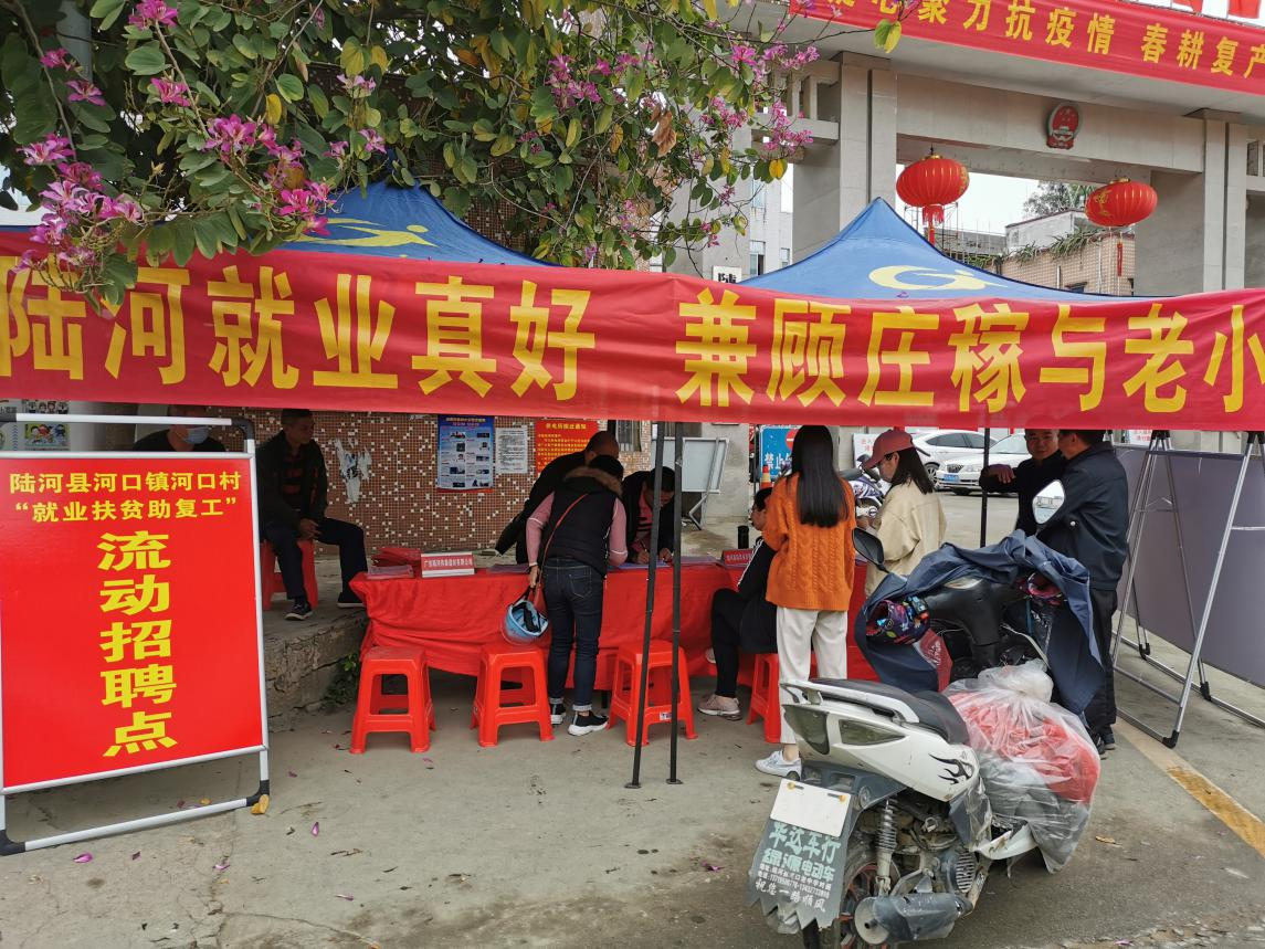 为统筹做好我县疫情防控工作和经济社会发展工作,帮助贫困劳动力精准脱贫,引导各镇村、社区贫困人员、富余劳动力和重点群体就地就近就业,解决企业用工,通过就业扶贫推动企业复工复产,根据县委、县政府脱贫攻坚会议及复工复产有关工作部署,县人社局与县扶贫办联合开展陆河县“就业扶贫助复工”流动招聘活动。3月30日至4月1日,县人社局到河口镇河口村、麦湖村、剑门村、营下村等村组织开展“就业扶贫助复工”流动招聘活动,服务专员以进农村、进农户的方式双管齐下,点对点开展就业专项招聘服务,做到就业复产双促进。