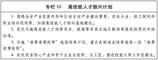 (四)优化人才公共服务机制。完善人才引进和服务政策,建立高层次人才、高技能人才引进“绿色通道”。促进粤港澳地区人才自由流动,鼓励引进港澳创新人才和创新资源,建设粤港澳创业创新合作示范园区。大力引进海外高层次人才,支持高层次留学人员携尖端技术、高端项目来粤创业。制定外国人才来粤工作服务与管理暂行办法。完善外国人才在粤工作信用和监管体系。(省人力资源社会保障厅、公安厅、外办、港澳办负责)