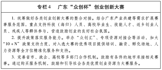 (四)激发各类人才创业创新活力。细化促进高校毕业生、退役军人、残疾人、登记失业人员等群体创业补贴扶持政策。高校、科研院所等单位的专业技术人员经原单位同意,可携科研项目和成果,保留基本待遇到企业开展创新工作或创业。大力支持异地务工人员等返乡创业。引导城镇失业人员等其他各类人员以创业促就业。有效整合各部门、各领域创业创新政策资源,统筹做好广东“众创杯”等各类创业创新大赛。(省人力资源社会保障厅、教育厅、科技厅,省残联负责)