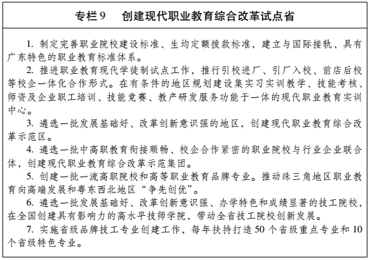 (二)深化现代职业教育综合改革试点。优化职业教育战略布局,推动职业教育内涵发展,完善现代职业教育体系,争创一批国家级高水平职业学校和骨干专业。深化产教融合、校企合作,推行校企双制办学,扩大现代学徒制和企业新型学徒制试点。推动职业院校、技工院校和大型骨干企业组建校企联盟,支持创建一批现代职业教育综合改革示范集团。实施技工教育创新发展行动计划,重点推进服务产业、高端引领、强师领航、教学改革、百校协作、优质就业、人才发展、“互联网+技工教育”等8项计划。扶持打造20个有品牌特色、实力强的国家级技工示范院校。继续扩大技师学院高级工以上学制教育规模,推进学制教育培养技师试点。(省教育厅、人力资源社会保障厅负责)