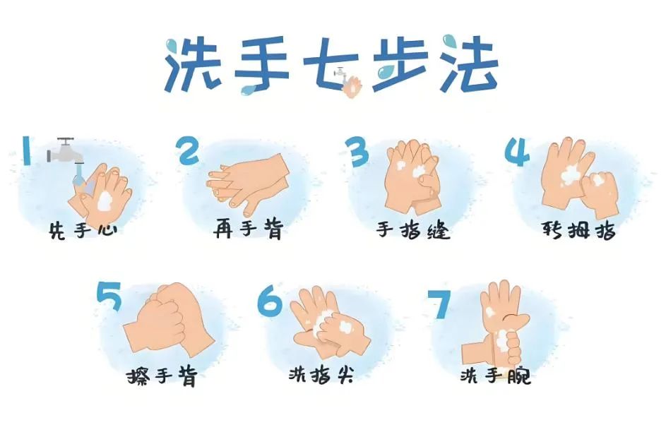 保持良好的手卫生习惯,饭前、便前便后、触摸眼口鼻前、接触污染物后均应用流动水按“七步洗手法”洗手,或用速干手消毒剂、消毒湿巾进行手消毒;