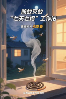 1.家家户户点蚊香。倡导市民群众在蚊虫活跃时段和集中消杀时段,于室内安全规范使用合格蚊香、电蚊液或电蚊拍等物理灭蚊工具。