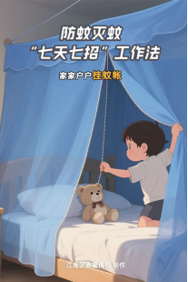 2.家家户户挂蚊帐。倡导市民群众在睡眠时使用蚊帐,将其与外界环境隔离开,减少蚊虫接触的机会,从而降低再次被蚊虫叮咬感染病毒的可能性。