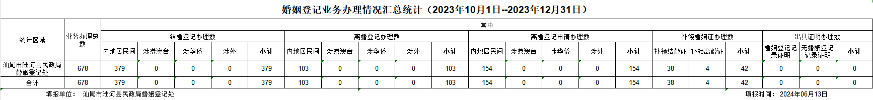 陆河县2023年10-12月婚姻登记业务办理汇总统计
