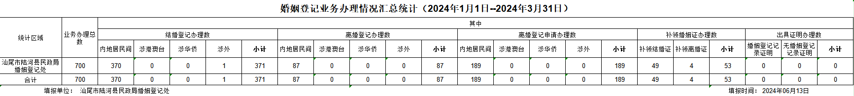 陆河县2024年1-3月婚姻登记业务办理汇总统计