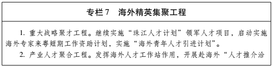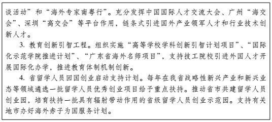 (四)优化人才公共服务机制。完善人才引进和服务政策,建立高层次人才、高技能人才引进“绿色通道”。促进粤港澳地区人才自由流动,鼓励引进港澳创新人才和创新资源,建设粤港澳创业创新合作示范园区。大力引进海外高层次人才,支持高层次留学人员携尖端技术、高端项目来粤创业。制定外国人才来粤工作服务与管理暂行办法。完善外国人才在粤工作信用和监管体系。(省人力资源社会保障厅、公安厅、外办、港澳办负责)