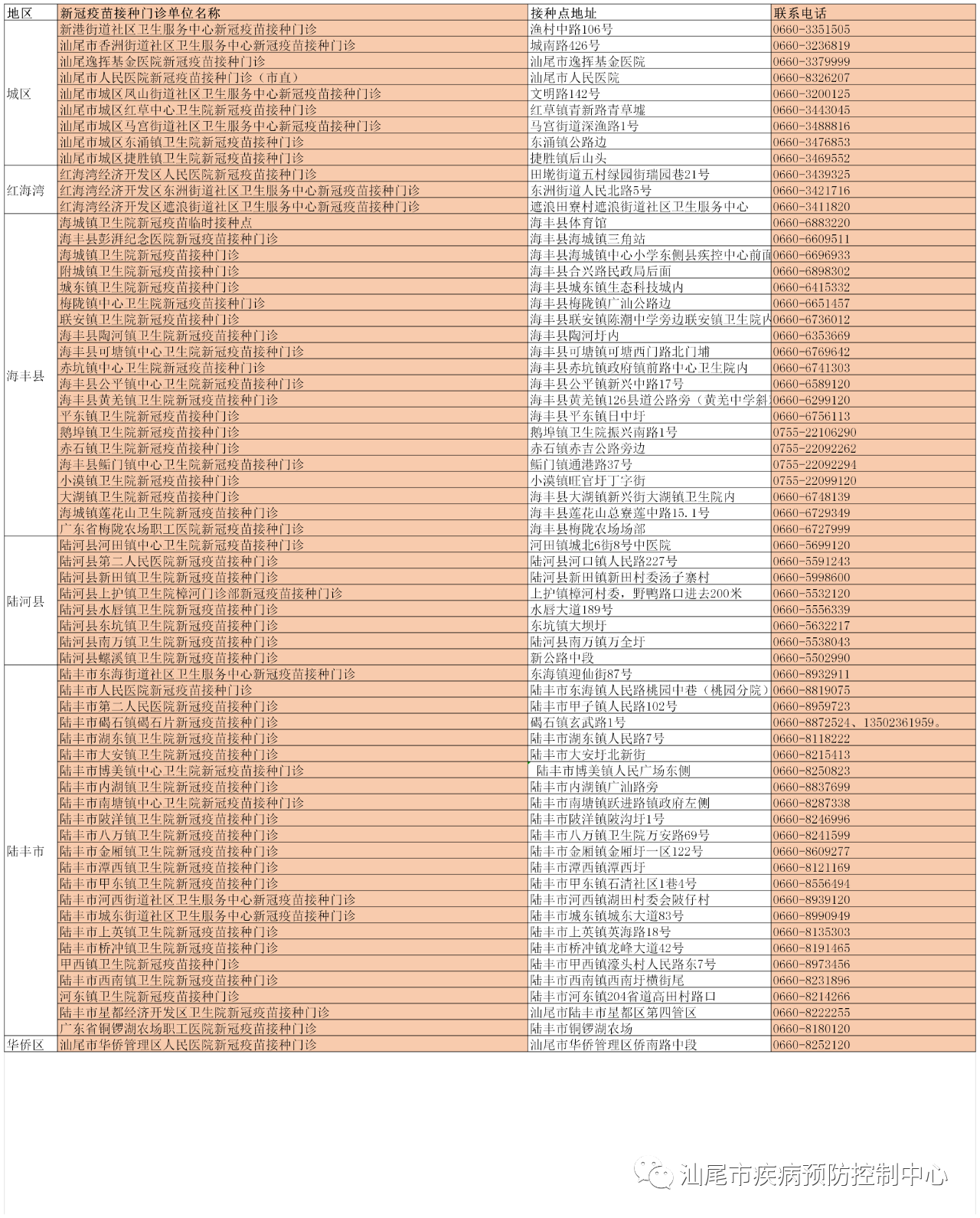 全市新冠疫苗接种门诊名单:
