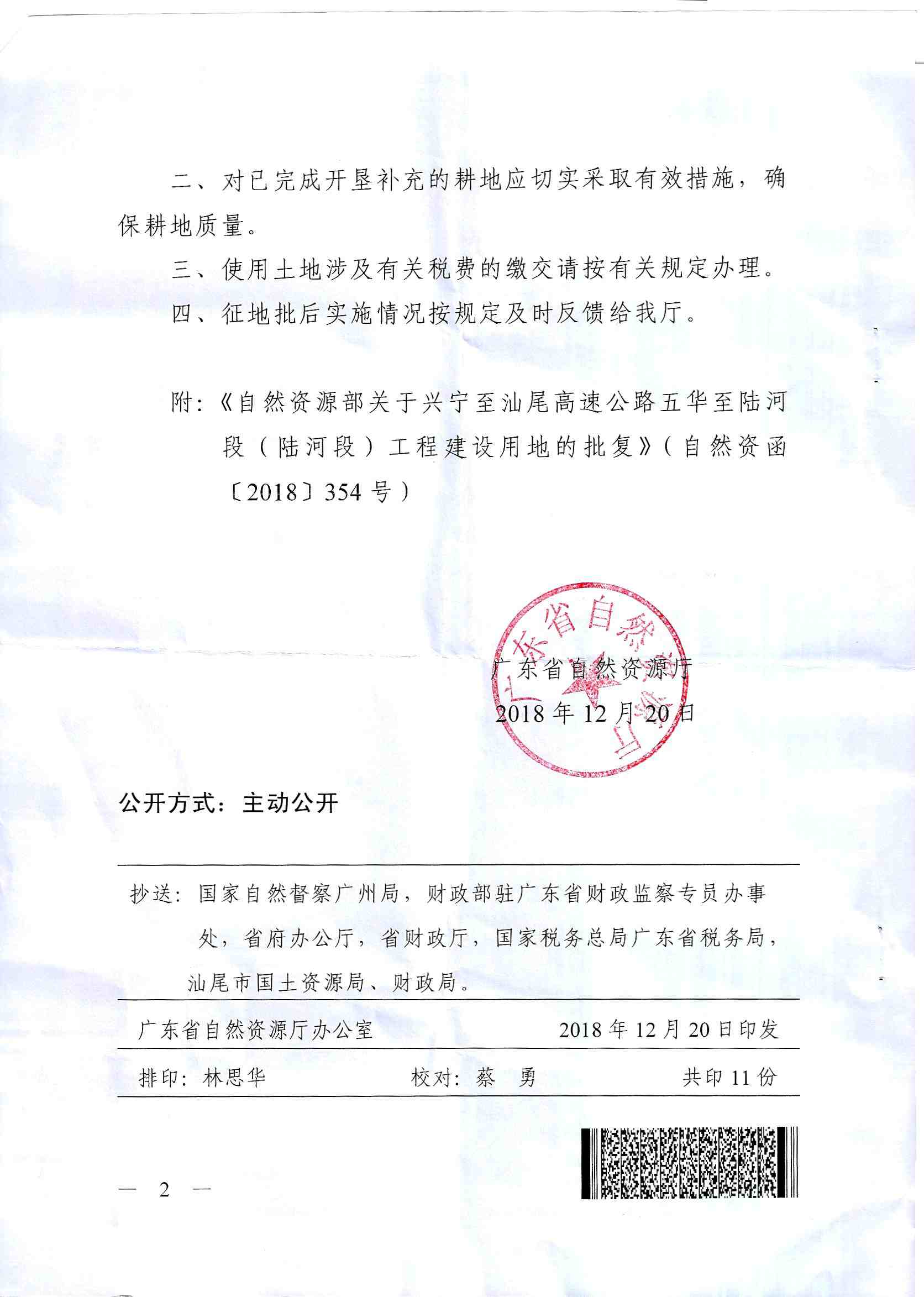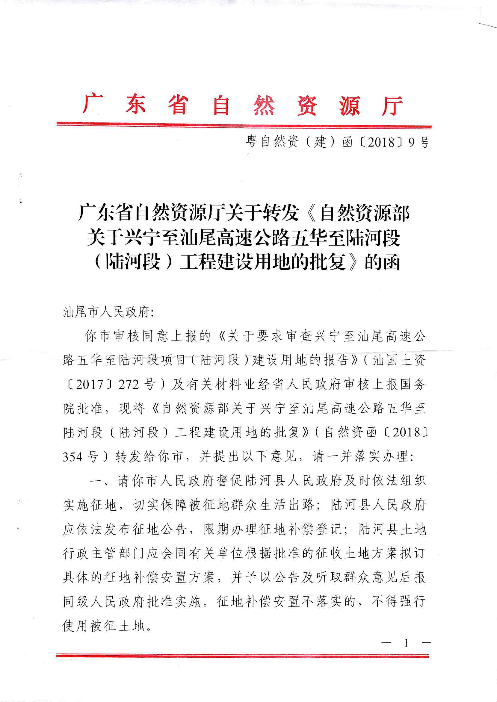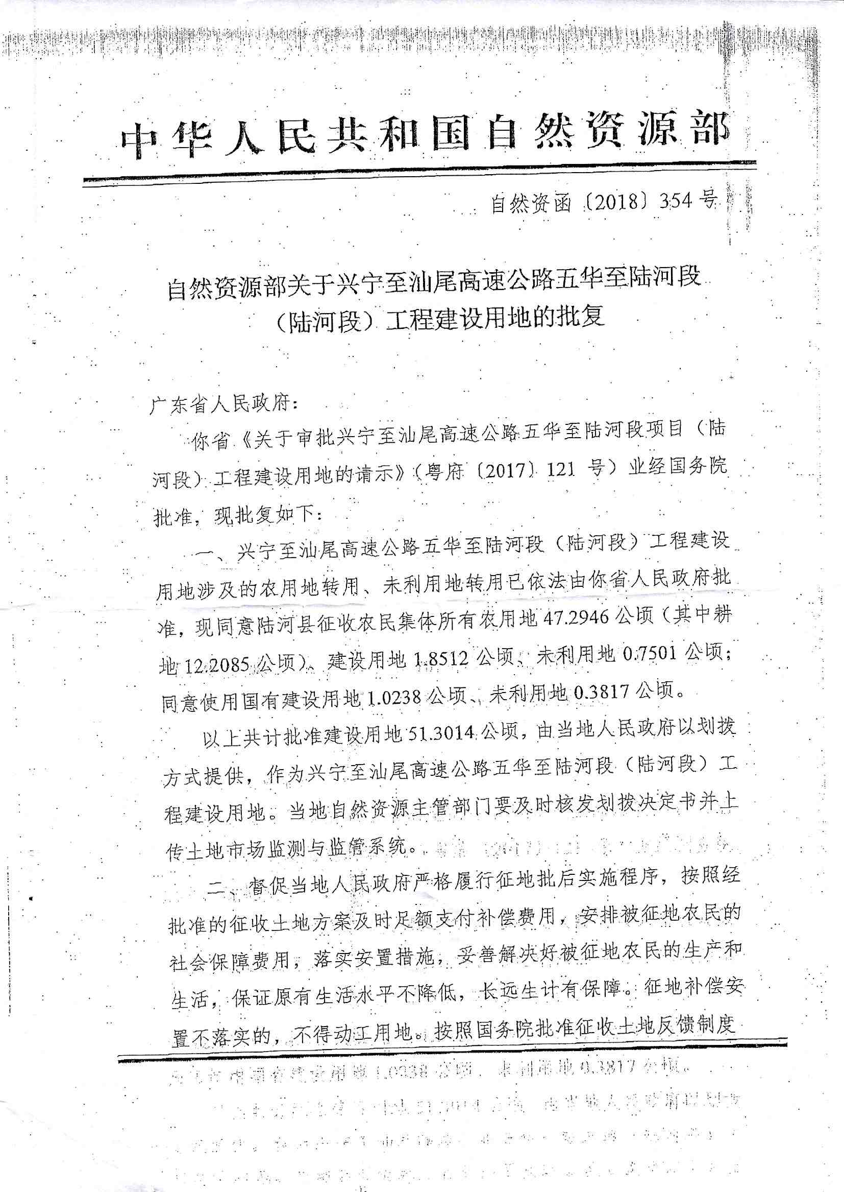 广东省自然资源厅关于转发《自然资源部关于兴宁至汕尾高速公路五华至陆河段(陆河段)工程建设用地的批复》的函