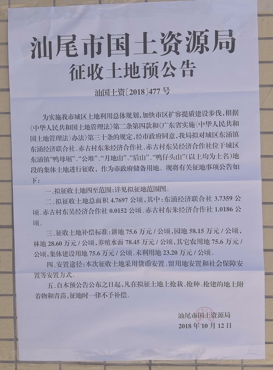 汕尾市国土资源局征收土地预公告(汕尾土资[2018]477号)