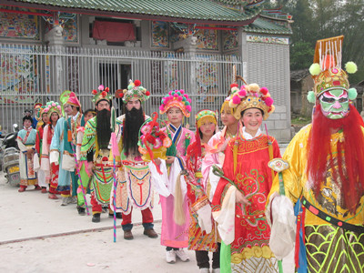 东坑地景是村民自觉参加的群众文化艺术活动,整个巡游队伍是由300余人组成。以民族英雄人物、传奇故事、古典文学等为题材饰演出一个个栩栩如生的人物,如:花木兰从军、金山战鼓、岳母刺字、八仙过海、八仙骑八兽、薛仁贵征东等。出游时间是每年的正月十五日晚上六点开始,从本村出发,沿着各村各寨依次游行表演。其时,喧天的锣鼓声、鞭炮声、乐奏声和欢笑声交织成一支欢快的田野交响乐,回荡于村寨的天地间,呈现出一派天、地、人一体同春、和谐共融的大平盛世景象。而地景的服装、道具都是出自本村老艺人指导下制作而成。此中,老艺人们开动脑筋,想方设法把服装、道具工艺制作得更切贴戏剧的艺术造型的要求,又赋于其独特的个性,让每一个传统艺术造型都焕发出无限魅力。