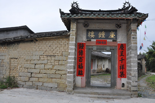 庆钟楼位于广东省汕尾市陆河县东坑镇新东村委飞燕自然村,是当地彭氏22世祖彭简才于1797年动工兴建,是陆河县客家人典型民居之一,总面阔39.2米,总进深29.4米,占地面积1152.5平方米。庆钟楼的整体设计模型如同过去我们客家人磨谷的砻一样,中间有如砻心般的“上五下五‘布局,四周共有26间房子和一堵围墙像砻衣似的外围把整座“上五下五”包围起来形成一个整体。故当地人称之为“砻衣屋”。