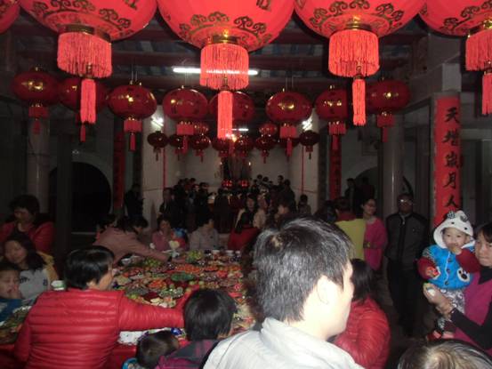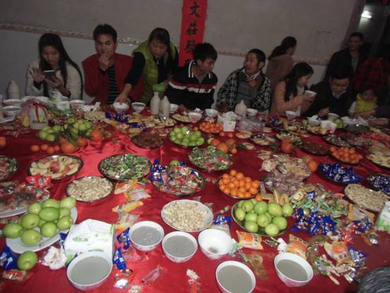这个时候最热闹的莫过于祠堂里面了,因为这是公众场所,人们都喜欢把食物拿到这里摆放可以方便人们,于是,祠堂里面就会更加具有节日的气氛——男人们会大声地喝酒,高声地吆喝;妇女们会讨论自己的家事、别人的家事、畅谈今年的发展和去年的收入等,最开心的莫非过于是孩子们了,他们笑着、追逐着、围在糖果的桌子周围跑来跑去,吃着村民提供的免费糖果,谈论着谁家的糖准备得多且好吃。也有些妇女会在悄悄地议论着谁家的茶擂得好。