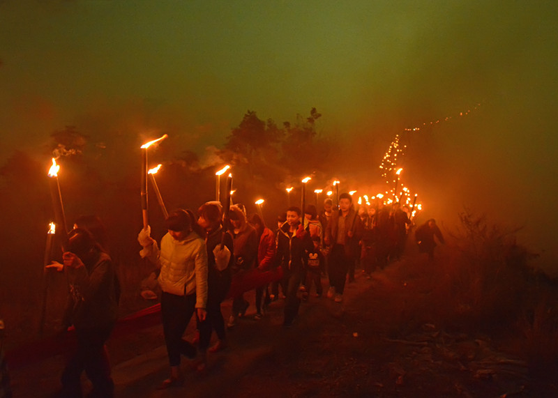 支支火把汇集成一条巨大的火龙”牵龙”队伍沿着蜿蜒的山路而下,场而壮观。(图:罗兆安 文:洪广凭 彭伟君 罗新焕)