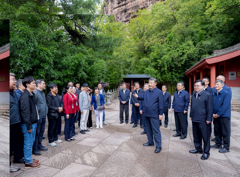 随后,习近平来到麦积山石窟,沿着栈道仔细察看距今1600多年的洞窟和雕塑、壁画,同保护修复工作人员亲切交流。习近平说,我国四大石窟是中华文明的瑰宝,都具有重要的历史价值、文化价值。他希望文物工作者赓续“莫高精神”,潜心为国护宝,为传承创新中华优秀传统文化、增强中华文化影响力作出更大贡献。