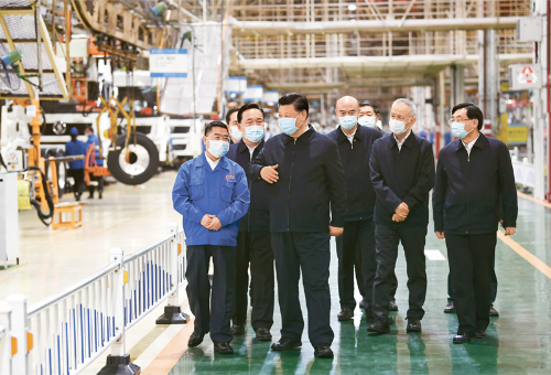 这是4月22日,习近平在陕西汽车控股集团有限公司总装车间察看生产线,了解产品研发、生产、销售和复工复产情况。