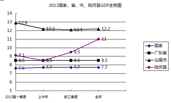 1、地区生产总值预期增长15%。主要基于以下三方面考虑:一是现实发展的需要。在世界经济缓慢复苏、国内经济稳增长调结构任务依然繁重,以及参照汕尾市的经济增长目标,提出15%的经济增长目标,有利于增强发展信心、稳定社会预期,有利于扩大城乡就业、保障改善民生。二是提升质量的需要。经过多年的较快发展,我县经济更加注重转型升级,加快结构调整、追求质量效益是“十二五”发展的核心任务。提出15%的经济增长目标,可以为全县结构调整和转型升级提供良好环境,引导全县各方面下更大功夫推进经济发展方式转变,下更大功夫提高经济发展的质量和效益。三是增强发展的协调性和可持续性。要在保持总量、优化结构和提高效率的前提下,正确处理好消费、投资、出口之间的关系,使三者的比例更加协调、结构更加合理、拉动更加有力,实现经济持续健康发展。