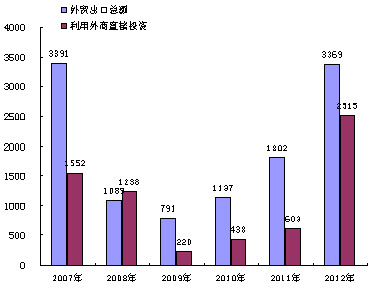 2007-2012年外贸出口总额和利用外商直接投资总额
