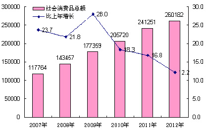 2007-2012年社会消费品总额及其增长速度