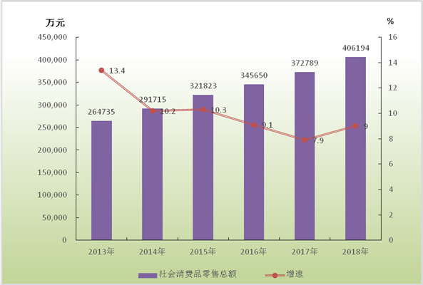 全年完成社会消费品零售总额406194万元,比上年增长9.0%。分行业看,批发业14545万元,增长2.8%;零售业365404万元,增长9.5%;住宿餐饮业26245万元,增长5.2%。分地域看,城镇消费品零售额272150万元,增长12.3%;农村消费品零售额134044万元,增长2.7%。