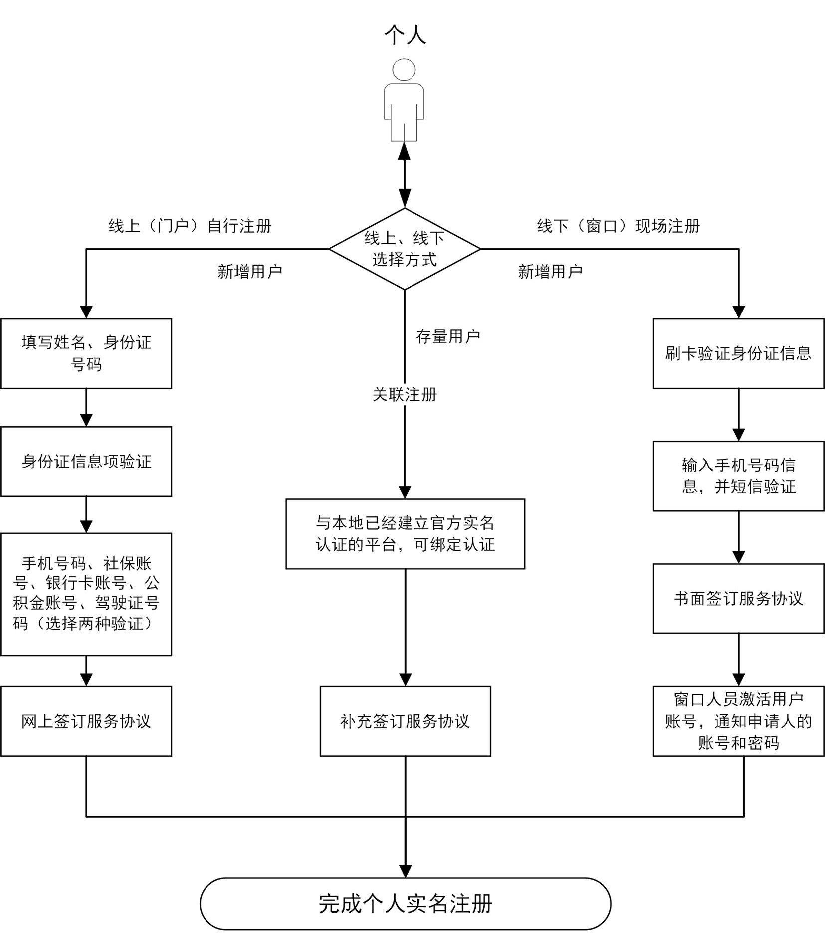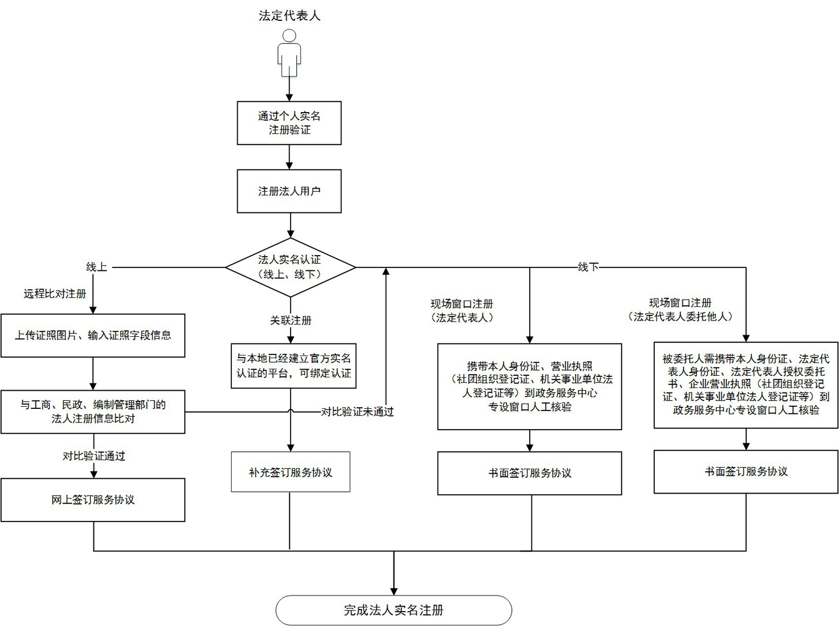【线上自行注册】申请人注册时,根据注册向导功能,填写用户姓名、身份证号码等基本信息。为保证实时性、安全性、准确性,注册时须不少于三种认证内容,其中身份证信息为必选项,手机号码、社会保障卡信息、银行卡账号、公积金账号、驾驶证档案编号等信息任选两项进行实名验证,验证完成后应签订网上服务协议,完成实名注册。 【线下窗口注册】在实体政务大厅专设窗口,申请人刷卡进行身份信息验证,并输入手机短信验证码进行确认,验证完成后书面签订服务协议,窗口人员激活用户账号,及时告知申请人的账号和密码,账号默认为身份证号码(登录后账号实际显示内容及运用中,可根据实际需求隐去年月日相关信息,以保护个人隐私),密码应自动随机生成,用户登录后可自行更改。 【关联注册】可通过与本地已经建立官方实名认证的平台,绑定认证,获取实名信息,并补充签订服务协议,完成快速注册。 法人用户注册过程如图5—2所示,主要包括线上远程比对注册、线下法人窗口注册和关联注册等方式。 图5-2 法人用户注册