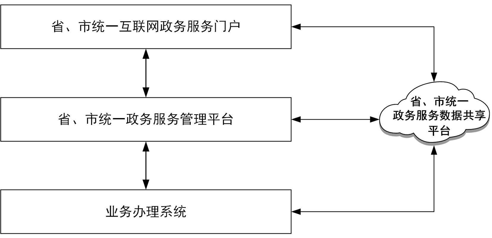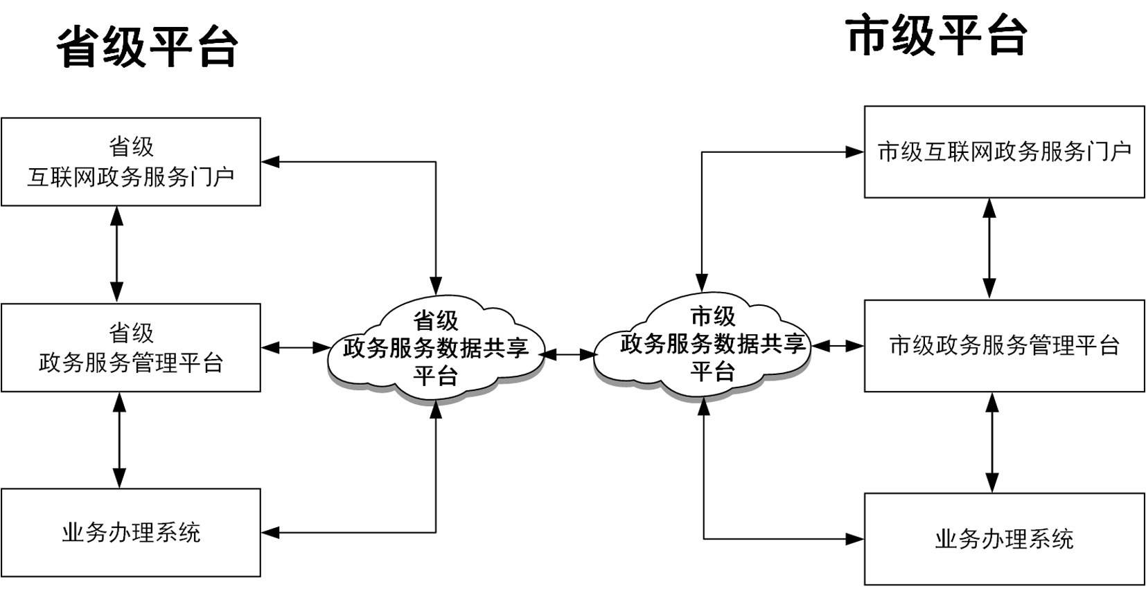 (2)统分方式 省级平台、地市级平台中互联网天天看高清影视在线官网门户统建,基础性及对外核心业务统建,天天看高清影视在线官网管理平台(可依托实体大厅或网上大厅)、业务办理系统分建,通过省、市两级天天看高清影视在线官网数据共享平台,实现省、市两级平台数据交换。如图3—4所示: 图3-4 “互联网+天天看高清影视在线官网”平台统分方式示意图