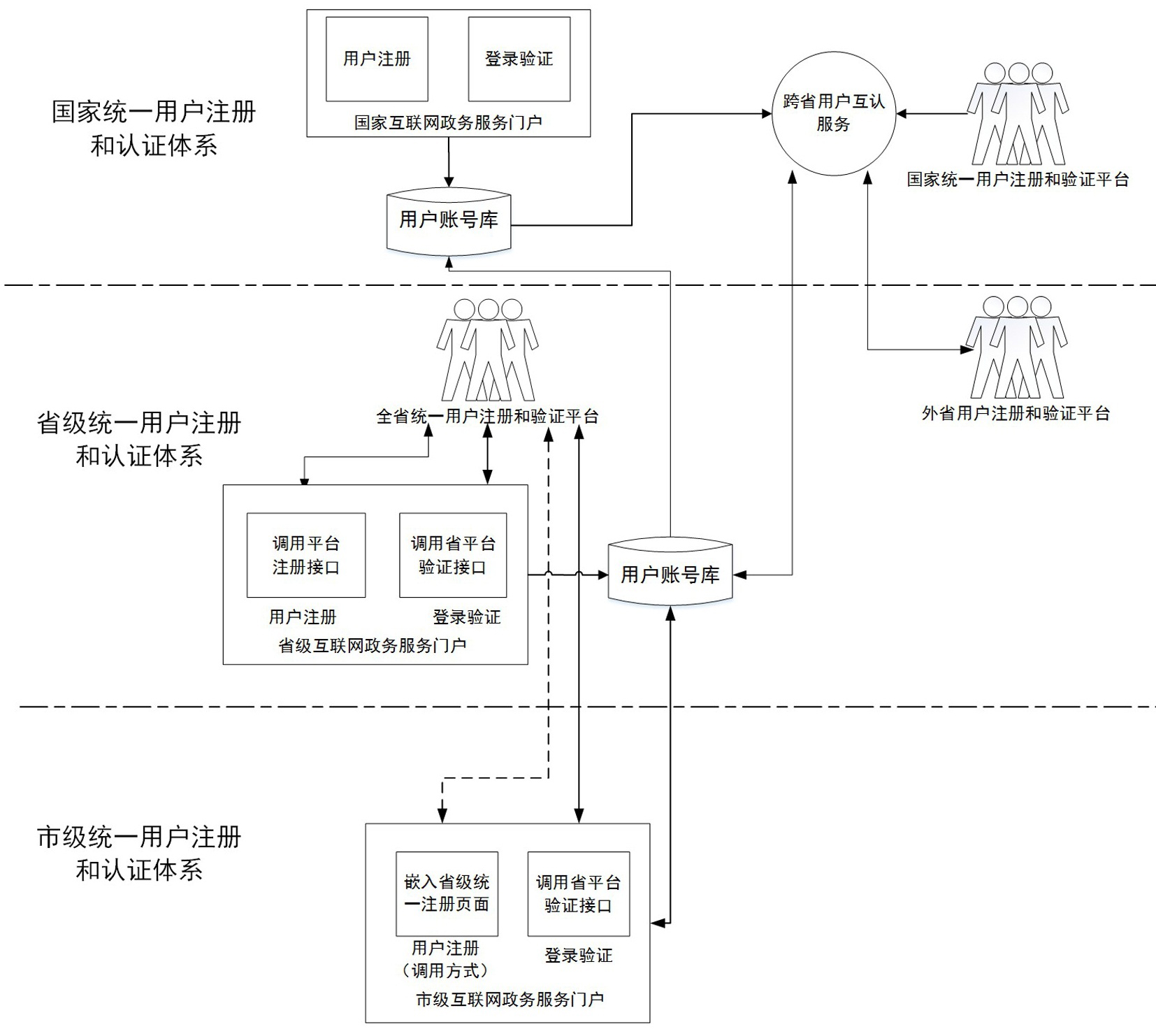 2.统分方式 用户可通过国家、省、市级互联网天天看高清影视在线官网门户注册和验证,市级互联网天天看高清影视在线官网门户注册和验证页面直接嵌入省级互联网天天看高清影视在线官网门户用户注册和验证页面,用户账号信息集中存储在省级天天看高清影视在线官网数据共享平台,省(区、市)内用户信息互认,用户跨省(区、市)登录验证时,通过国家用户互认服务,调用获取外省(区、市)用户信息。详细用户注册和验证流程如图3—9所示: 图3-9 统分方式用户注册和认证示意图