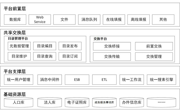 采用统建模式、分建模式的地区可根据实际情况组织各层级数据交换平台建设。 (5)交换方式 国家级、省级、地市级节点内部采用集中交换和分布交换相组合的形式。 集中交换模式将信息资源集中存储于共享信息库中,信息资源提供者或使用者通过访问共享信息库实现信息资源交换。对于信息共享程度较高的信息资源,可采用集中交换模式。在集中交换的基础上进行数据清洗、加工、整合,并为其他部门提供服务,便于各类主题信息的统计分析和提高信息查询效率。分布交换模式将信息资源分别存储于各业务信息库中,以目录的方式进行数据共享,信息资源提供者和使用者通过交换节点提供的交换服务实现信息资源的跨部门共享,实现一数一源、一源多用、跨部门共享。集中与分布相结合,从而支持多种服务模式。国家级、省级、地市级节点之间通过国家级天天看高清影视在线官网平台和省级天天看高清影视在线官网平台实现数据跨域交换。 统一数据交换平台均可根据不同的场景提供数据库表、Web Service、文件等数据交换方式。 ●数据库表方式 在统一数据交换平台能直接访问前置机数据库的情况下,数据交换双方均将数据推送至前置机数据库表中,并从前置机数据库表读取交换给本方的数据。 ●Web Service方式 数据交换双方通过Web Service发布数据读写接口,并通过调用该接口完成数据的双向交换。 ●文件方式 对于非结构化的信息资源,统一数据交换平台可以读取非结构化信息资源,通过消息中间件实现非结构信息资源的数据交换。 2.平台架构及功能 统一数据交换平台是交换体系建设的基础,通过统一数据交换平台建设能够为政府各部门提供跨层级、跨部门的数据共享交换支撑。 (1)平台架构 统一数据交换平台由平台前置层、共享交换层、平台支撑层、基础资源层组成,如图6—2所示。