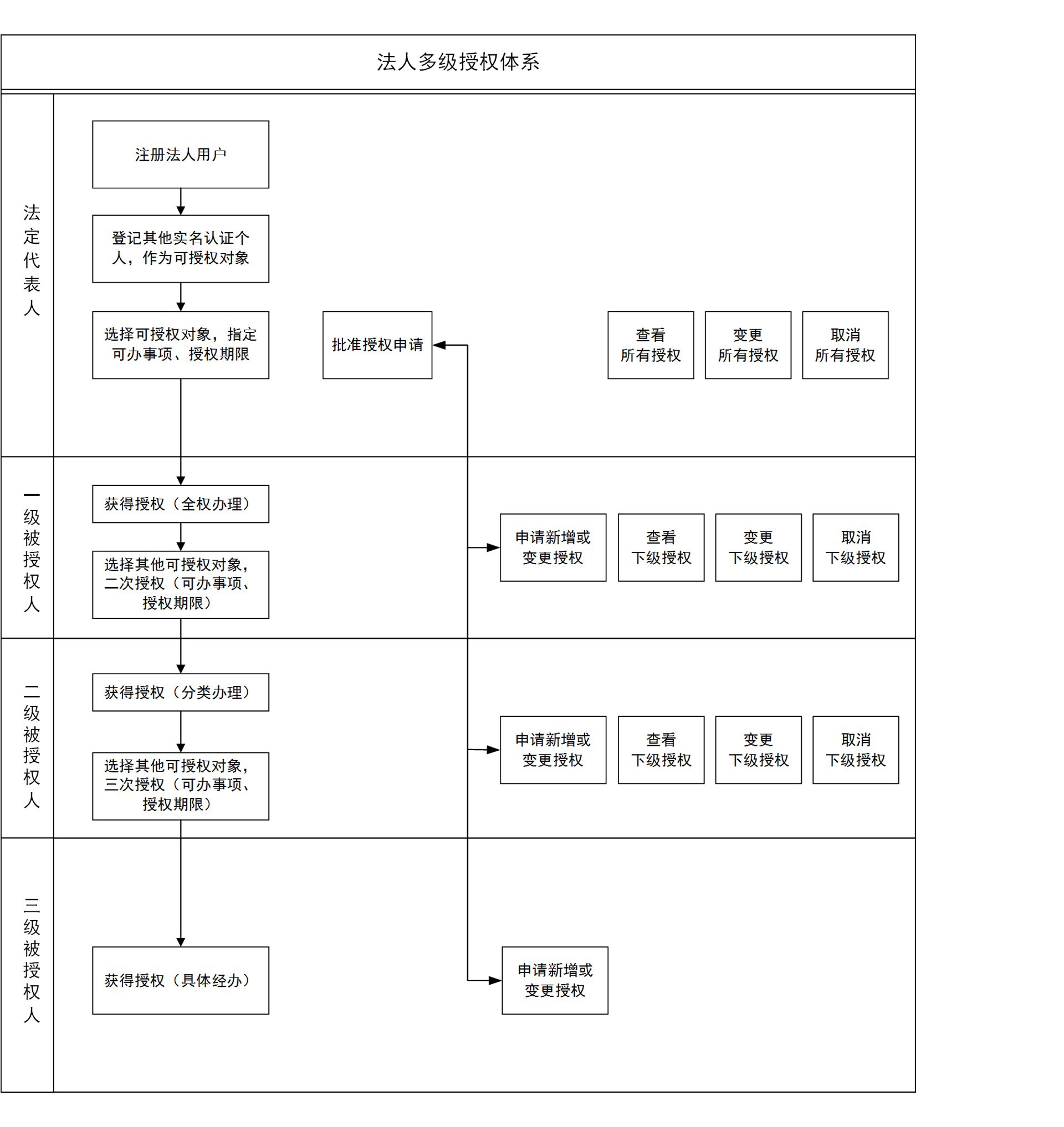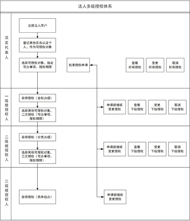 【法人远程比对注册】用户上传证照图片,输入证照信息,与工商、民政、编制管理部门的法人注册信息进行信息比对验证,或用户上传电子营业执照,验证通过后,网上签订服务协议,开通法人账号,并与法定代表人个人实名账号绑定,完成法人实名注册。法人用户变更流程与上述流程相同。 【法人窗口注册】法定代表人携带本人身份证、营业执照(社团组织登记证、机关事业单位法人登记证等)到实体政务大厅专设窗口人工核验,核验通过后,书面签订服务协议,完成法人用户实名注册。法定代表人委托他人现场办理的,被委托人需携带被委托人身份证、法定代表人身份证、法定代表人授权委托书、企业营业执照(社团组织登记证、机关事业单位法人登记证等)到实体政务大厅专设窗口人工核验,核验通过后,书面签订服务协议,完成法人用户实名注册。法人用户变更流程与上述流程相同。 【关联注册】已使用企业CA认证或电子营业执照的用户,进行绑定认证,获取实名信息,并补充签订服务协议,完成快速注册。 ③用户登录 用户PC端登录:默认采用身份证号码登录,或已绑定手机号码登录、手机APP扫描二维码登录,登录过程中应采用短信验证、密码等方式提高安全性。 用户移动APP端登录:默认采用身份证号码登录,或已绑定手机号码登录。登录过程中应采用短信验证、密码等方式提高安全性。 (2)用户管理 ①自我管理:应具备用户信息的维护管理功能,具体应包括以下功能。 【找回密码】用户遗忘登录密码时,可通过注册手机号码,发送、确认短信验证码,重置密码。也可凭身份证到实体政务大厅,经实体政务大厅专设窗口人员审核确认后,将自动生成的新密码告知用户。 【更换绑定手机号码】用户更换绑定手机号码,须通过原绑定手机号码短信验证确认解除绑定,并通过新手机号码短信验证绑定。 【法人用户授权】法人用户应具有多级授权,可设定被授权人、授权有效期、服务事项范围,被授权人可进行再次授权,授权层级最多三层,具备授权、申请授权、变更授权、取消授权、授权查看等功能。具体授权过程如图5—3所示: 图5-3 法人用户授权