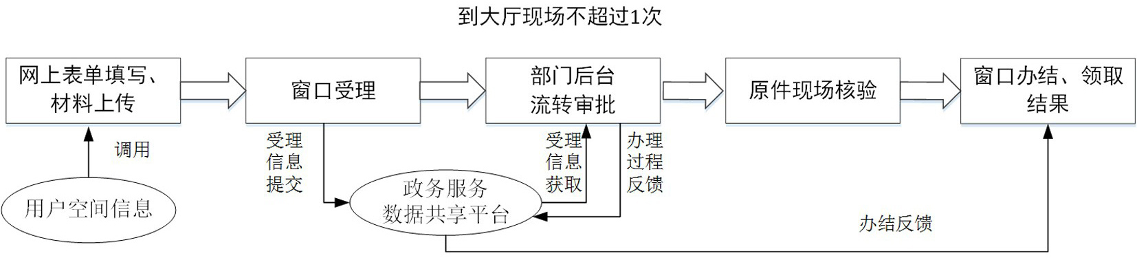 【原件核验】申请人网上提交申请后,默认申请人提交的所有信息材料真实有效,如材料符合办理条件,窗口人员通过天天看高清影视在线官网管理平台受理,如材料不符合条件,以短信、移动终端等通知申请人网上补正材料,受理通过后由天天看高清影视在线官网实施机构工作人员通过业务办理系统进行审批办理,并将审批过程、结果反馈给天天看高清影视在线官网管理平台,窗口人员统一办结,到发证环节时通知申请人携带原件材料到窗口核验,核验通过后领取结果,整个办事过程应到大厅现场不超过1次。具体流程如图5—5所示: